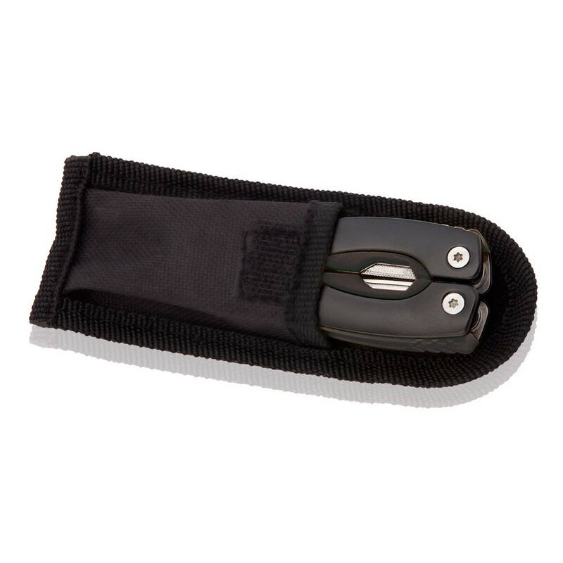 Narzędzie wielofunkcyjne w czarnym pokrowcu, posiada 12 funkcji oraz kolorowy uchwyt z czarnymi elementami, produkt wykonany z aluminium i stali nierdzewnej