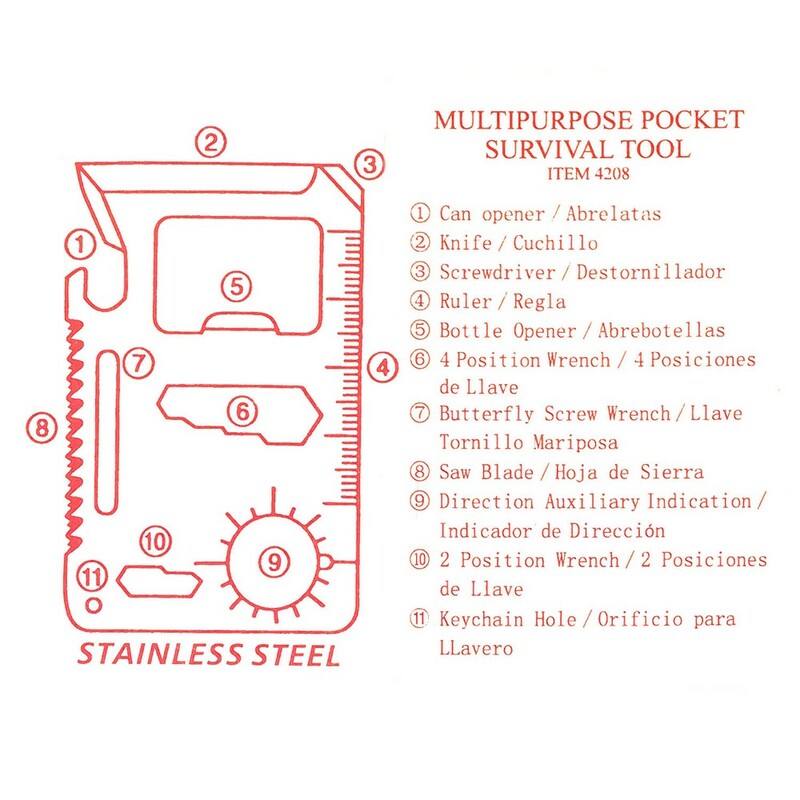 Narzędzie wielofunkcyjne w etui, 11 funkcji, otwieracz do puszek, nóż, śrubokręt, linijka, otwieracz do butelek, klucze do nakrętek, klucze motylkowe, piła, kątomierz