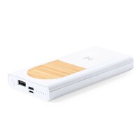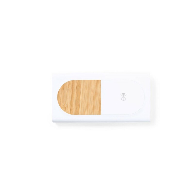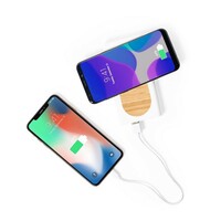 Bezprzewodowy power bank 8000 mAh, bezprzewodowa ładowarka 15W, elementy z bambusa, funkcja szybkiego ładowania, działa z telefonami posiadającymi możliwość ładowania indukcyjnego, wyjście USB 5-12V/3-1.5A, wejście/wyjście USB typu C 5-12V/3-1.67A, wejście micro USB 5-12V/3-1.5A, 4 diody wskazujące poziom naładowania, kabel micro USB w komplecie