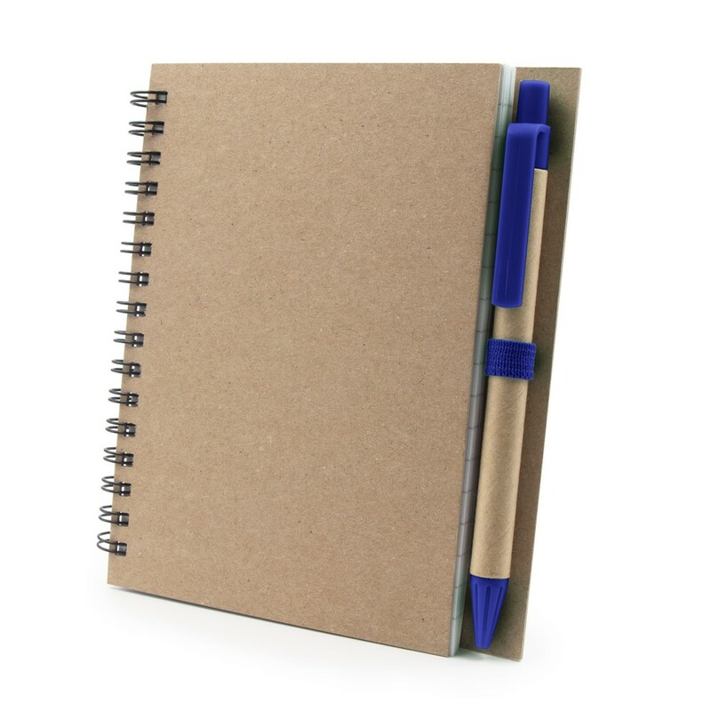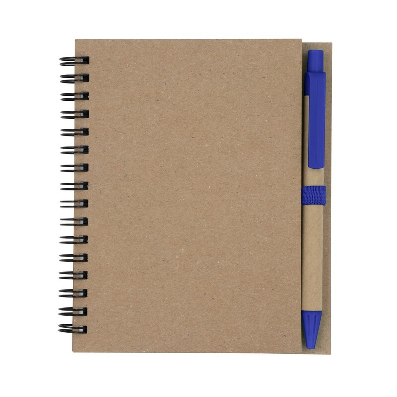 Notatnik A6 (50 kartek 80 g/m2 w linie), twarda okładka z kartonu z recyklingu, spiralne bindowanie, w komplecie długopis z trzonem z kartonu z recyklingu i kolorowymi elementami (wyprodukowany w Ukrainie / made in Ukraine)