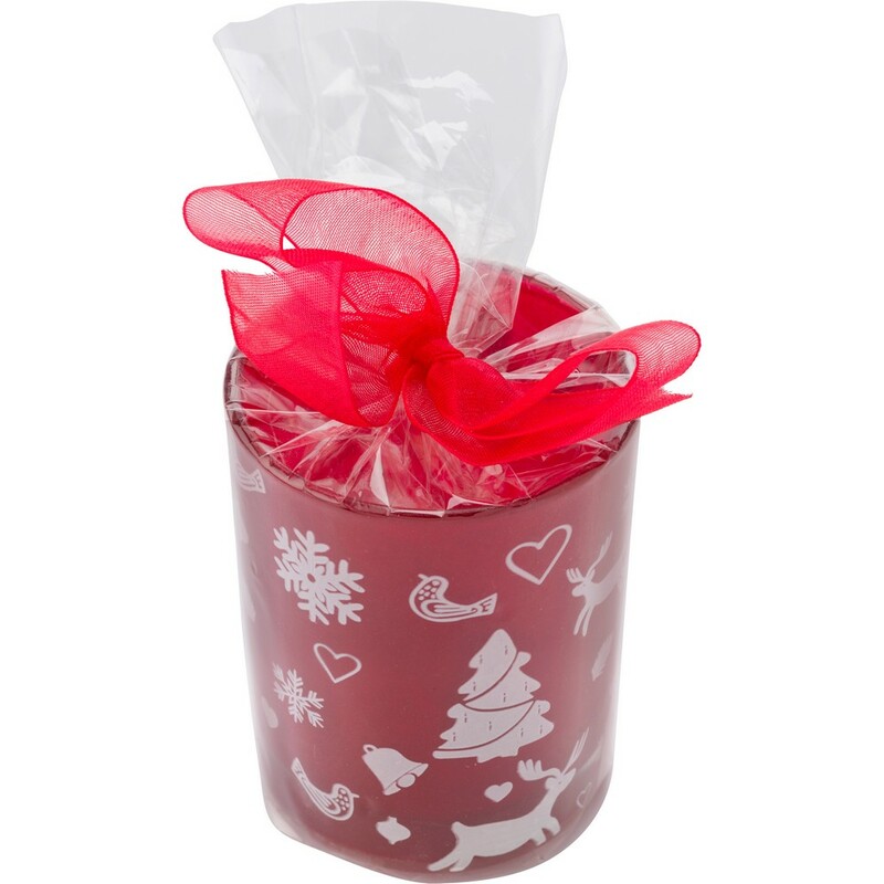 Ozdobny świecznik ze świeczką, zapakowany w folię z czerwoną wstążką