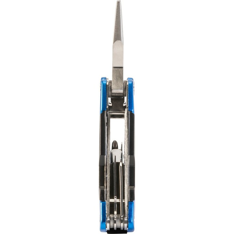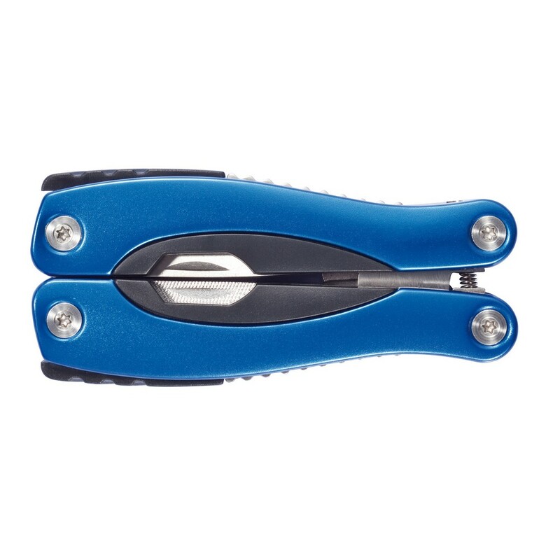 Narzędzie wielofunkcyjne, 10 funkcji: kombinerki, piła, nóż, 2 śrubokręty (płaski i krzyżakowy), pilnik, otwieracz do butelek, skrobak do ryb, dziadek do orzechów, linijka (w calach), w pokrowcu