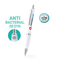 Długopis z antybakteryjnym trzonem, srebrne elementy, posiada specjalny dodatek (nanosrebro) zapobiegający namnażaniu się bakterii na powierzchni długopisu, spełnia wymagania normy ISO 22196:2011