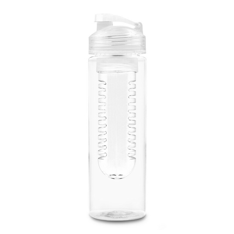 Butelka sportowa 650 ml, posiada pojemnik na lód lub owoce umożliwiający nadanie wodzie smaku według własnych preferencji, zakrętka z kolorowym zamknięciem, butelka przeznaczona wyłącznie do zimnych i niegazowanych napojów, produkt wykonany z plastiku