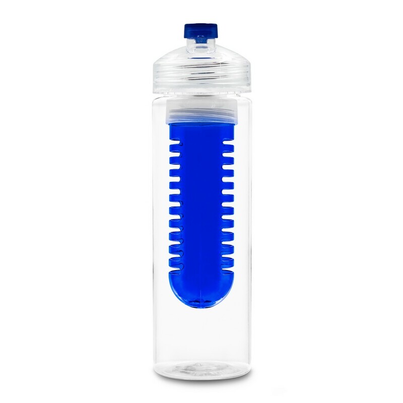 Butelka sportowa 650 ml, posiada pojemnik na lód lub owoce umożliwiający nadanie wodzie smaku według własnych preferencji, zakrętka z kolorowym zamknięciem, butelka przeznaczona wyłącznie do zimnych i niegazowanych napojów, produkt wykonany z plastiku