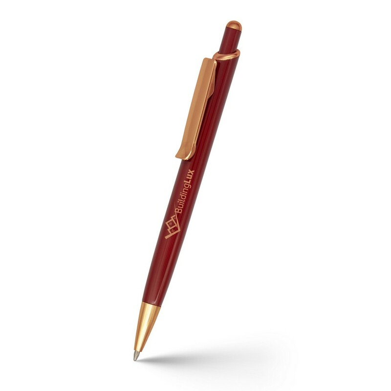 Długopis z kolorowym trzonem i błyszczącymi elementami kolorze różowego złota, wkład w niebieskim kolorze, grawer ukazuje powierzchnię w kolorze złotym, produkt wykonany z aluminium