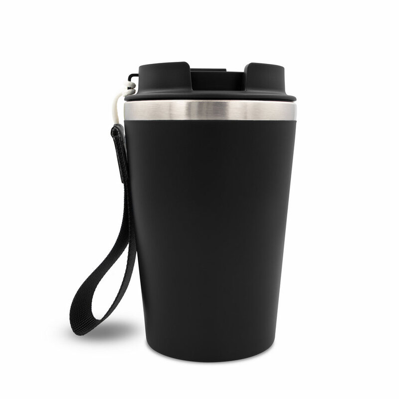 Kubek termiczny 350 ml, posiada podwójne ścianki ze stali nierdzewnej z recyklingu i plastiku, pasek ułatwiający noszenie lub przypięcie, produkt wykonany ze stali nierdzewnej z recyklingu i PP, utrzymuje temperaturę napojów gorących do 4 godzin +leakproof
