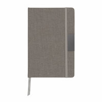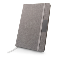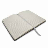 Notatnik w formacie A5, posiada 80 kartek w linie (160 stron), dodatkowe zamknięcie w postaci dopasowanej kolorystycznie elastycznej opaski, posiada metalowy element na grawerunek logotypu lub hasła, twarda okładka wykonana z RPET