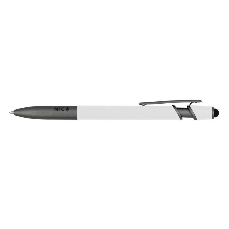 Długopis z chipem NFC (Near Field Communication), działa z urządzeniami posiadającymi technologię NFC, posiada matowy trzon o gumowym wykończeniu i elementy w grafitowym kolorze, końcówka touch pen umożliwia obsługę ekranów dotykowych, wkład w niebieskim kolorze, grawer ukazuje lśniącą powierzchnię. NFC to międzynarodowy standard komunikacji bezprzewodowej wymiany danych na niewielkie odległości. Umieszczony w długopisie chip umożliwia zapisanie na nim np. adresu strony internetowej, który zostanie odczytany przez urządzenie z technologią NFC po zbliżeniu go do logotypu NFC znajdującego się na produkcie. Produkt wykonany z aluminium z recyklingu oraz plastiku.