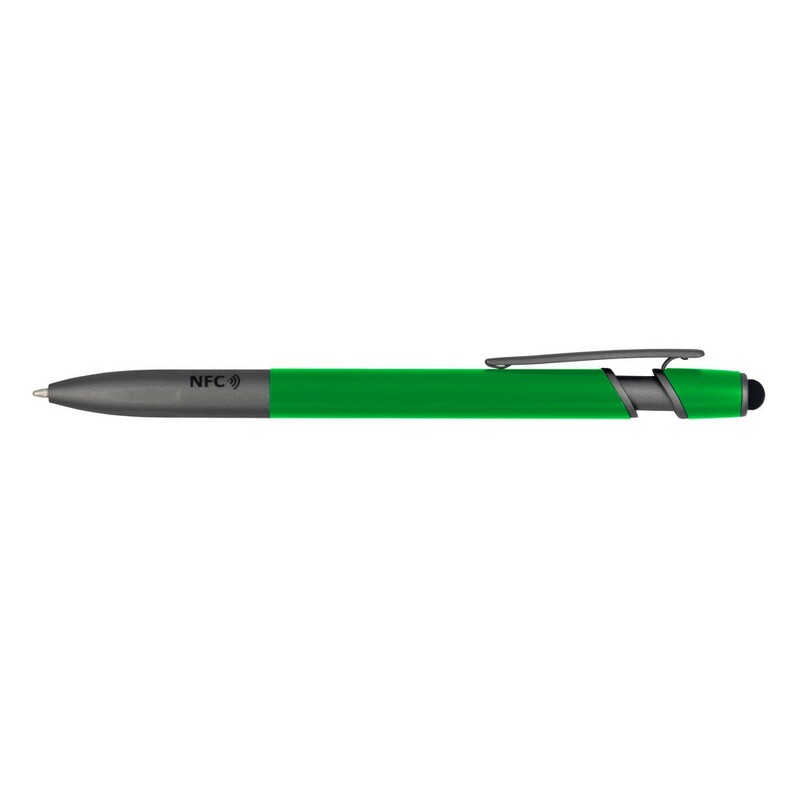 Długopis z chipem NFC (Near Field Communication), działa z urządzeniami posiadającymi technologię NFC, posiada matowy trzon o gumowym wykończeniu i elementy w grafitowym kolorze, końcówka touch pen umożliwia obsługę ekranów dotykowych, wkład w niebieskim kolorze, grawer ukazuje lśniącą powierzchnię. NFC to międzynarodowy standard komunikacji bezprzewodowej wymiany danych na niewielkie odległości. Umieszczony w długopisie chip umożliwia zapisanie na nim np. adresu strony internetowej, który zostanie odczytany przez urządzenie z technologią NFC po zbliżeniu go do logotypu NFC znajdującego się na produkcie. Produkt wykonany z aluminium z recyklingu oraz plastiku.