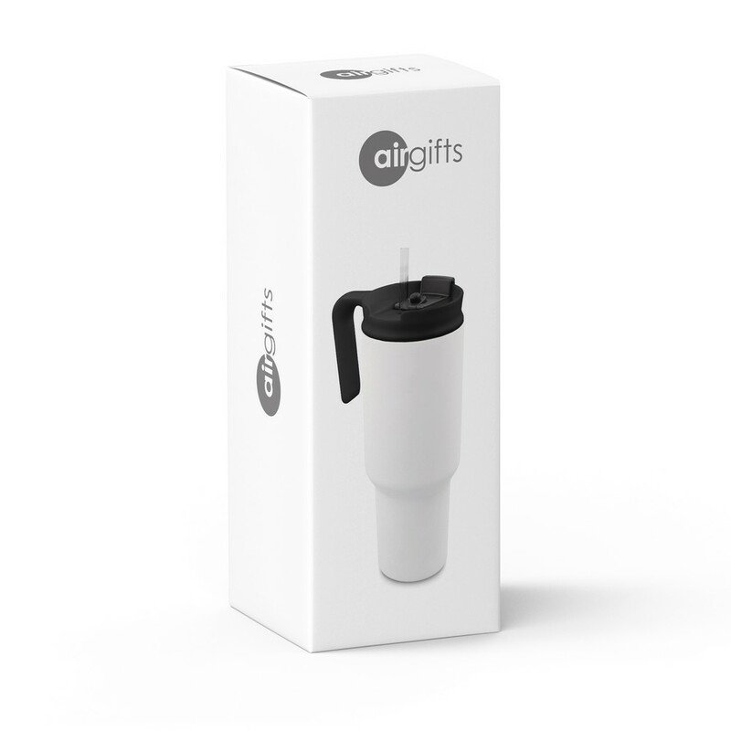Kubek termiczny 1100 ml Air Gifts ze słomką i ergonomicznym uchwytem, zaprojektowany specjalnie pod technologię znakowania UV360, posiada podwójne ścianki ze stali nierdzewnej z próżnią między ściankami, co spowalnia oddawanie temperatury na zewnątrz, zachowując funkcje termosu, produkt wykonany ze stali nierdzewnej i plastiku, utrzymuje temperaturę napojów gorących do 15 godzin +leakproof