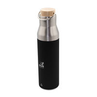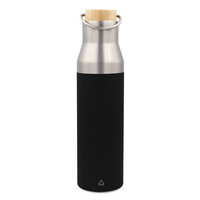Butelka termiczna 550 ml, posiada podwójne ścianki ze stali nierdzewnej z próżnią między ściankami, co spowalnia oddawanie temperatury na zewnątrz, zachowując funkcje termosu, zakrętka z bambusowym elementem i metalowym uchwytem ułatwiającym noszenie lub przypięcie, produkt wykonany m.in. ze stali nierdzewnej recyklingu, utrzymuje temperaturę napojów gorących do 20 godzin +leakproof