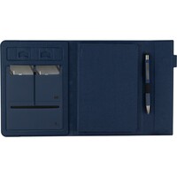 Teczka konferencyjna w formacie ok. A5, zawiera notatnik posiada 64 kartki w linie, przegródki na dokumenty, uchwyt na telefon, zamknięcie magnetyczne, pakowany pojedynczo w kraftowy rękaw, produkt wykonany z RPET