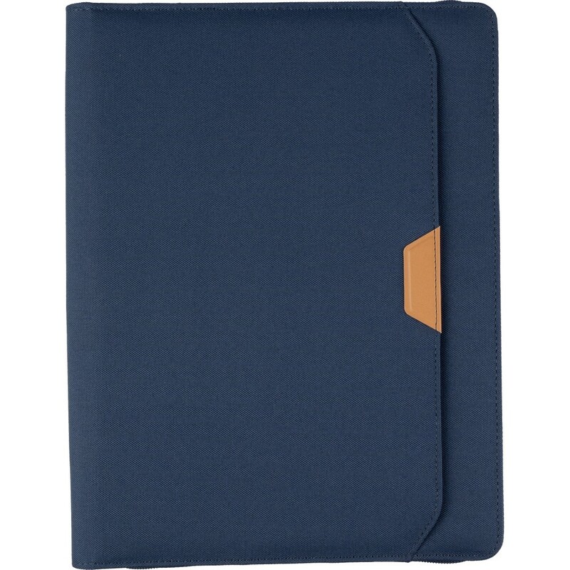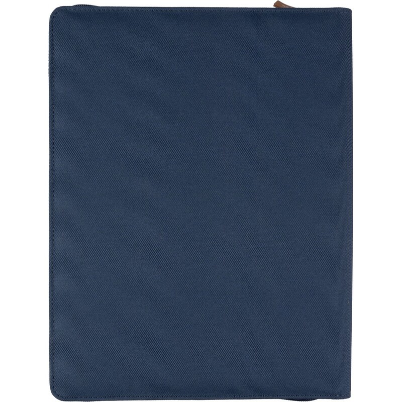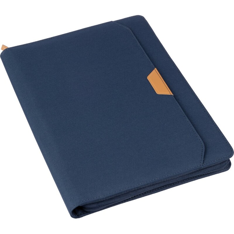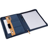 Teczka konferencyjna w formacie ok. A4, posiada 20 kartek w linie, przegródki na dokumenty, pętelka na długopis, mała przednia kieszeń, pakowane pojedynczo w brązowe kraftowe pudełko, produkt wykonany z RPET