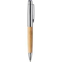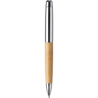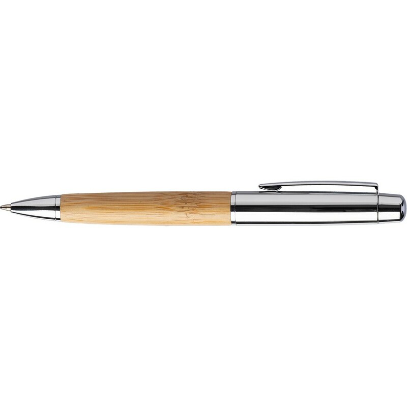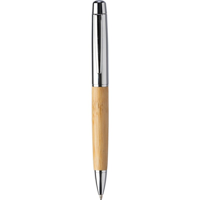 Długopis przekręcany z bambusowym trzonem, posiada niebieski wkład, bambusowa tuba chroniąca przed zniszczeniem w komplecie, produkt wykonany ze stali nierdzewnej
