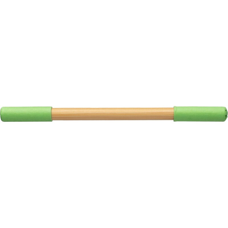 "Wieczny" ołówek i długopis w jednym, wolnościerająca się końcówka ołówka powoduje jego dłuższe zużycie, posiada dwie kolorowe zatyczki z kartonu, produkt wykonany z bambusa