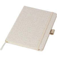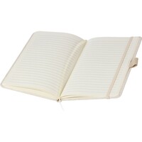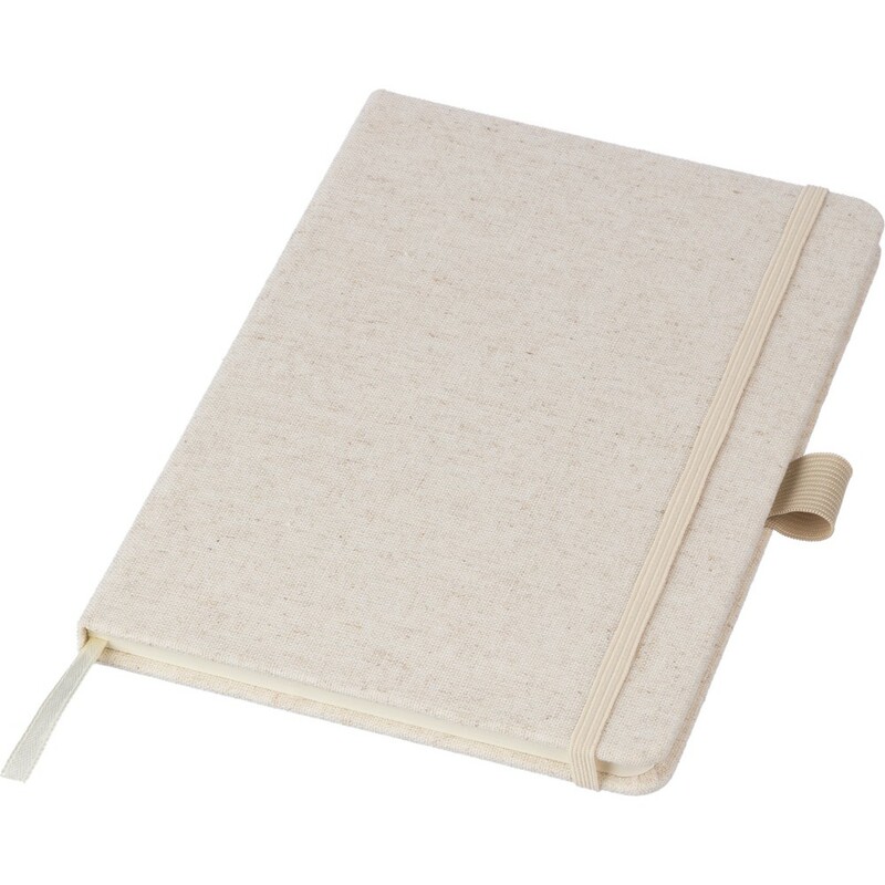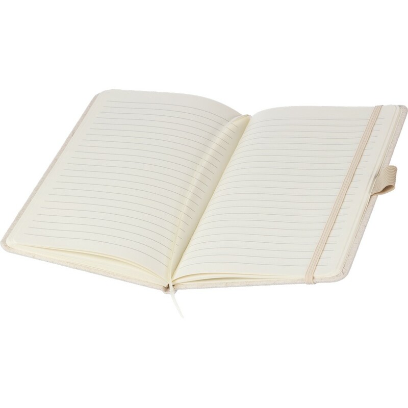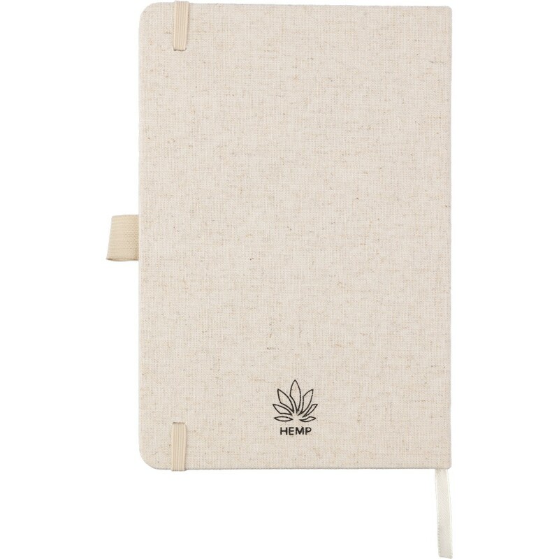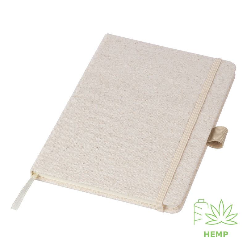 Notatnik ok. A5, posiada 80 stron w linie, tasiemka zakładkowa umożliwia wygodne zaznaczanie ostatniej strony lub ważniejszych notatek, dodatkowe zamknięcie w postaci dopasowanej kolorystycznie elastycznej opaski, posiada otwór na długopis, zmieści się do szkolnego plecaka, ikona konopi na produkcie, produkt wykonany z konopi