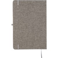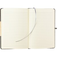 Notatnik ok. A5, posiada 80 stron w linie, tasiemka zakładkowa umożliwia wygodne zaznaczanie ostatniej strony lub ważniejszych notatek, dodatkowe zamknięcie w postaci dopasowanej kolorystycznie elastycznej opaski, składana okładka z bambusowym elementem zmienia się w stojak na telefon, zmieści się do szkolnego plecaka, produkt wykonany z RPET