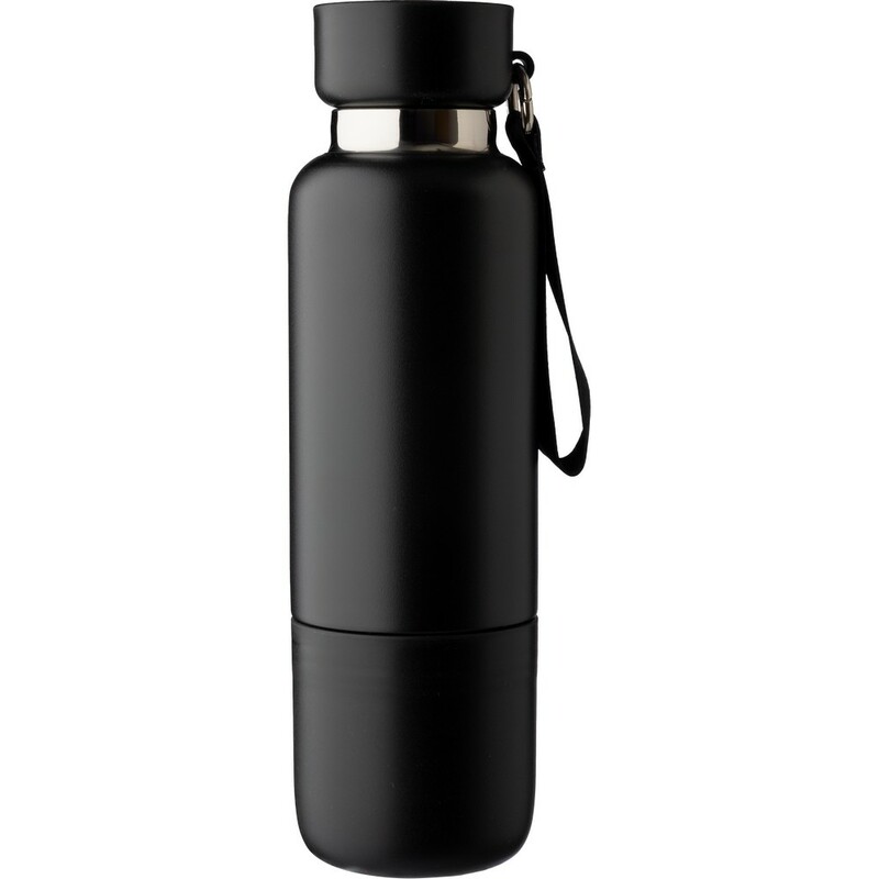 Butelka termiczna 500 ml, posiada podwójne ścianki ze stali nierdzewnej z próżnią między ściankami, co spowalnia oddawanie temperatury na zewnątrz, zachowując funkcje termosu, zakrętka funkcjonująca jako kubek umożliwia wygodne i higieniczne dzielenie się napojem, uchwyt ułatwiający noszenie, matowe wykończenie, produkt wykonany ze stali nierdzewnej, zakrętka z PP, uchwyt z poliestru, utrzymuje temperaturę napojów gorących do 20 godzin +leakproof
