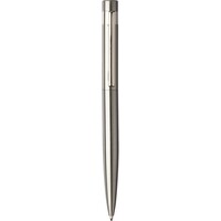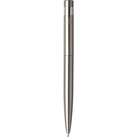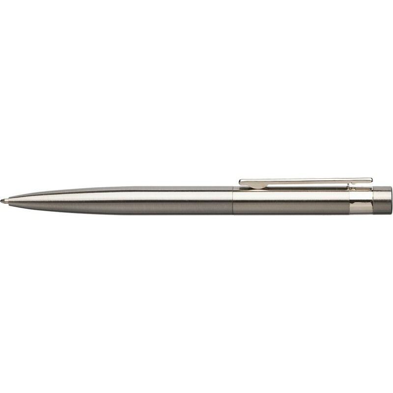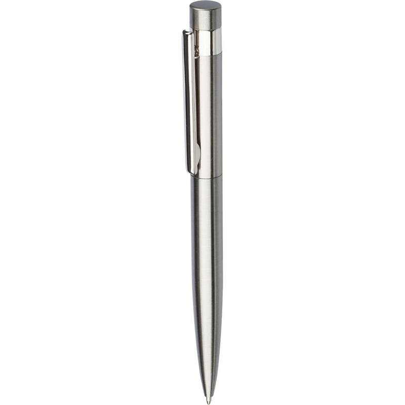 Długopis przekręcany, posiada wkład w niebieskim kolorze, ikona stali nierdzewnej z recyklingu na produkcie, zapakowany w pudełko prezentowe z papieru kraftowego, produkt wykonany ze stali nierdzewnej z recyklingu