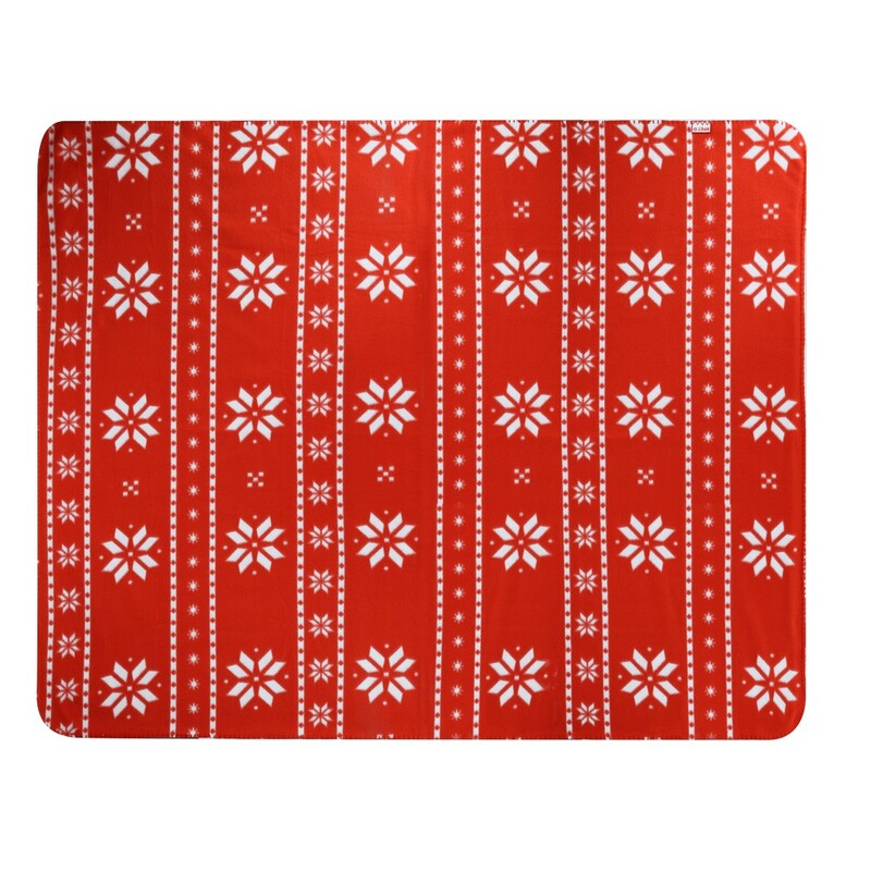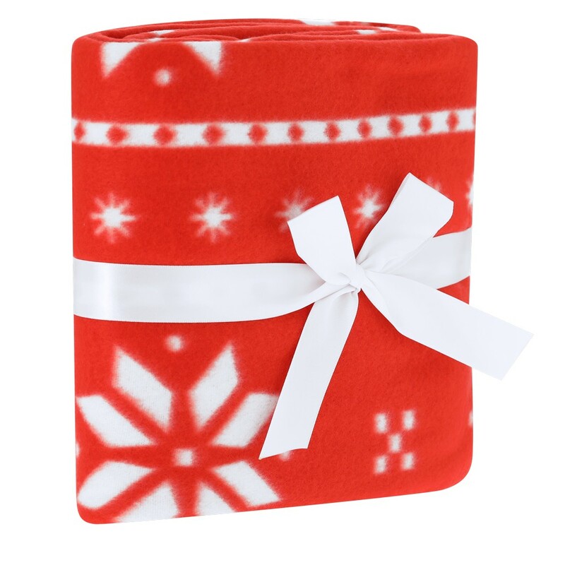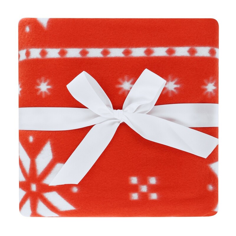 Koc ze świątecznym wzorem, posiada specjalną etykietę do znakowania oraz ozdobną wstążkę, materiał zapobiegający mechaceniu, produkt wykonany z poliestru RPET 200 g/m2