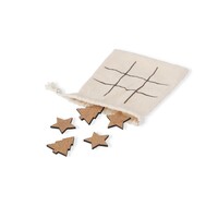 Gra "kółko i krzyżyk" ze świątecznym wzorem, posiada 5 żetonów w kształcie choinki oraz 5 żetonów w kształcie gwiazdy, w komplecie bawełniany woreczek pełniący funkcję planszy do gry, produkt wykonany z korka