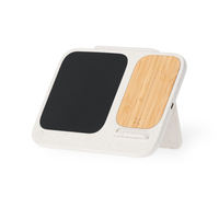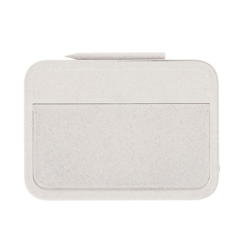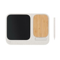 Ładowarka bezprzewodowa 15W, działa z urządzeniami posiadającymi możliwość ładowania indukcyjnego, zintegrowana tablica LCD z dołączonym rysikiem umożliwiającym zostawianie wiadomości lub rysowanie, posiada przycisk wymazywania i blokadę zapobiegającą wymazywaniu, wejście USB-C 5-9V/2A, kabel USB-C w komplecie, stojak na telefon, produkt wykonany z włókien słomy pszenicznej, ABS i bambusa