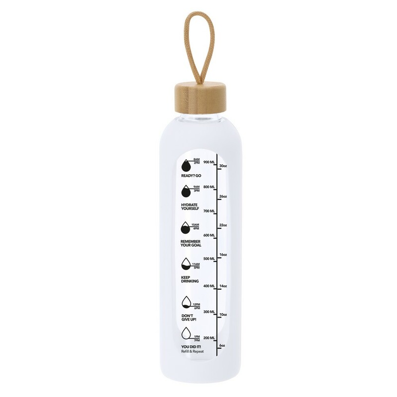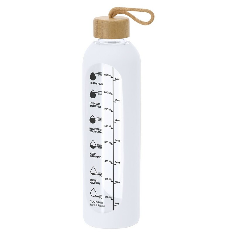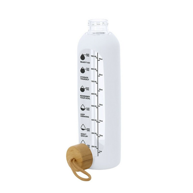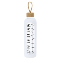 Butelka 1000 ml z bambusową zakrętką i uchwytem ułatwiającym noszenie, posiada silikonowy pokrowiec, produkt wykonany ze szkła