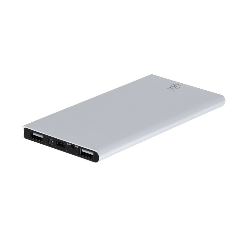 Power bank 8000 mAh, 5 diod wskazujących poziom naładowania, 2 wyjścia USB 5V/2.4A, wejście/wyjście USB-C 5V/2.4A, kabel USB-C w komplecie, produkt wykonany z aluminium z recyklingu