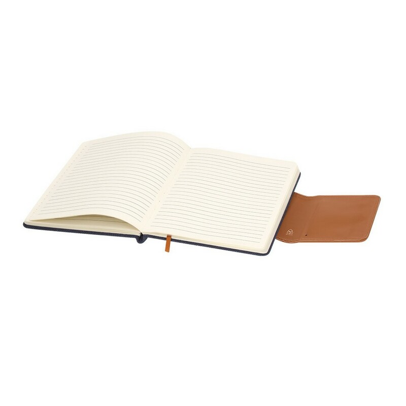 Notatnik w formacie ok. A5 z twardą okładką, posiada 80 pustych kartek oraz magnetyczne zamknięcie, produkt wykonany z płótna z recyklingu oraz PU z recyklingu