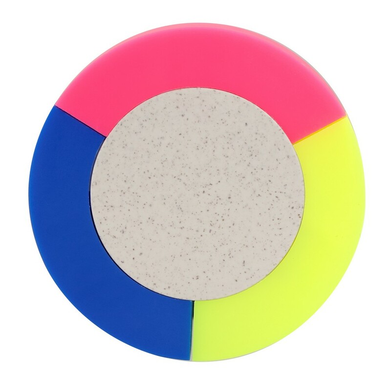 Zakreślacz w kształcie koła, 3 kolory: różowy, niebieski, żółty, produkt wykonany ze słomy pszenicznej i ABS