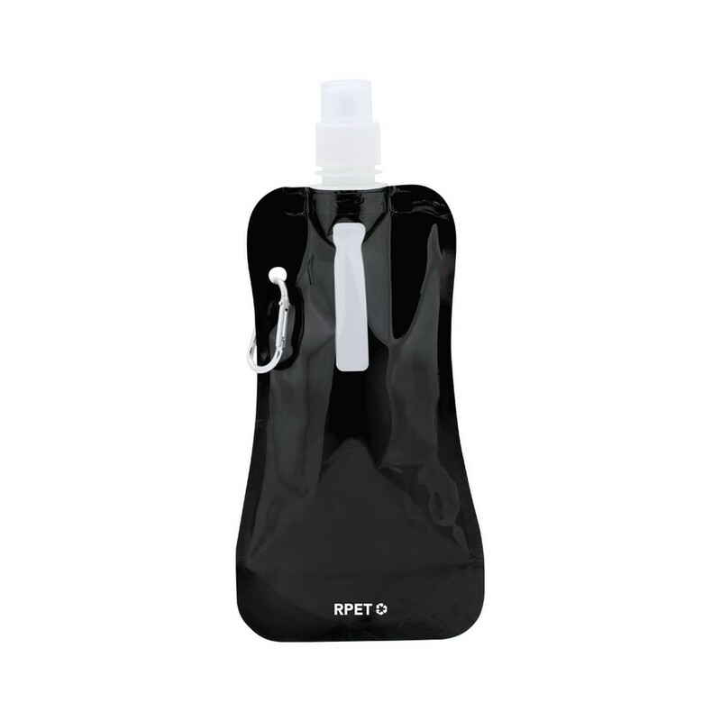 Składany bidon 400 ml z karabińczykiem umożliwiającym przypinanie, dziubek ułatwiający picie, po złożeniu może zmieścić się nawet w kieszeni, produkt wykonany z RPET