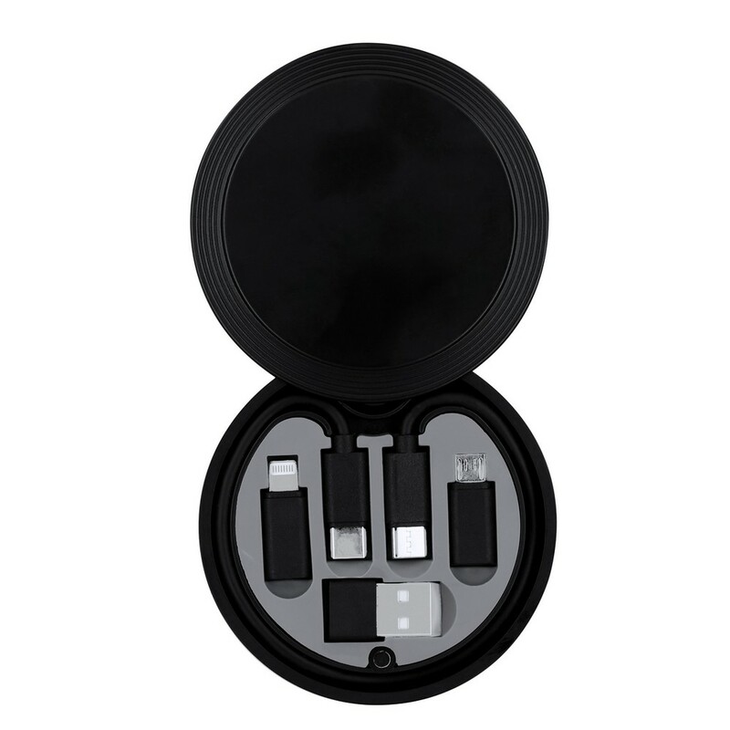Kabel do ładowania i synchronizacji z 2 końcówkami USB-C w etui z karabińczykiem umożliwiającym przypinanie, posiada 3 adaptery w komplecie z wejściami USB-C i końcówkami: USB, micro USB oraz kompatybilna z urządzeniami iOS, produkt wykonany z ABS