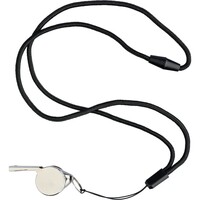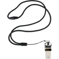 Gwizdek ze sznurkiem z poliestru, można go zawiesić na szyi albo wieszaku, wydaje głośny sygnał, zapakowany w brązowy kartonik, produkt wykonany z metalu