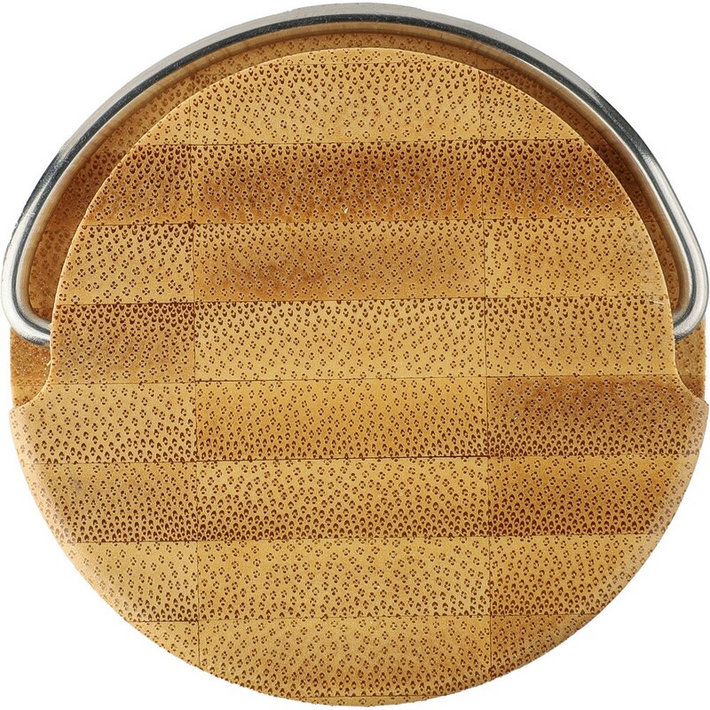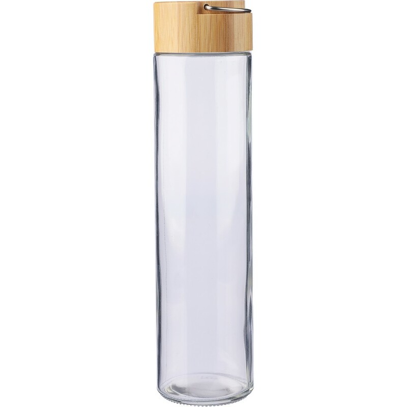 Szklana butelka 500 ml, metalowy uchwyt zwiększający wygodę użytkowania, bambusowa nakrętka, produkt zapakowany w brązowy kartonik