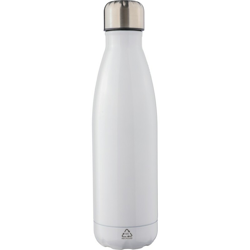 Butelka termiczna 500 ml, posiada podwójne ścianki ze stali nierdzewnej z recyklingu z próżnią między ściankami, co spowalnia oddawanie temperatury na zewnątrz, zachowując funkcje termosu, ikona stali nierdzewnej z recyklingu na produkcie, zapakowana w brązowy kartonik, utrzymuje temperaturę napojów gorących do 20 godzin +leakproof