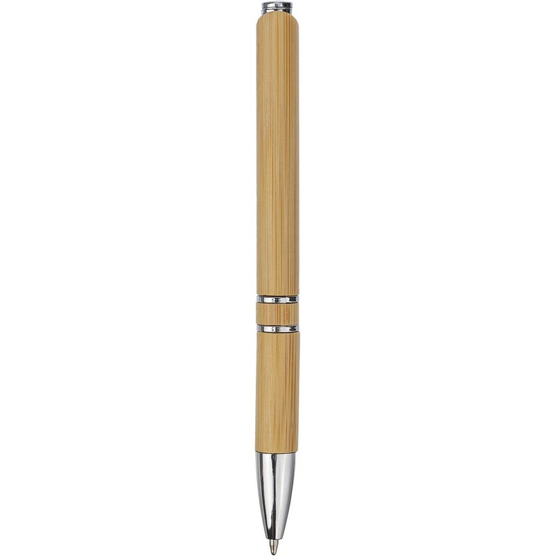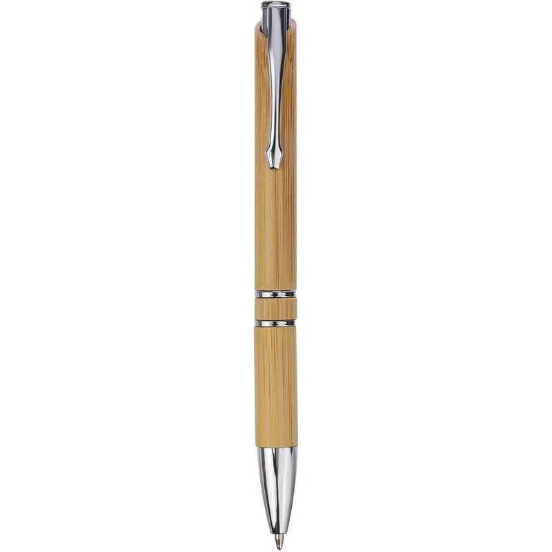 Długopis z chromowanymi detalami, klip ułatwiający zawieszanie na kieszeni albo okładce notatnika, wkład w czarnym kolorze, długość pisania ok. 800 m, produkt wykonany z bambusa, plastiku i metalu