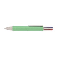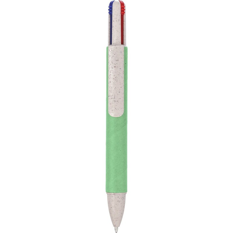 Czterokolorowy długopis, kolory wkładów: niebieski, czarny, czerwony i zielony, długość pisania 300 metrów na każdy kolor, klip ułatwiający zawieszanie na kieszeni albo okładce notatnika, produkt wykonany z kartonu pochodzącego z recyklingu i słomy pszenicznej