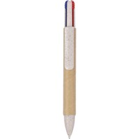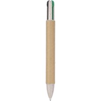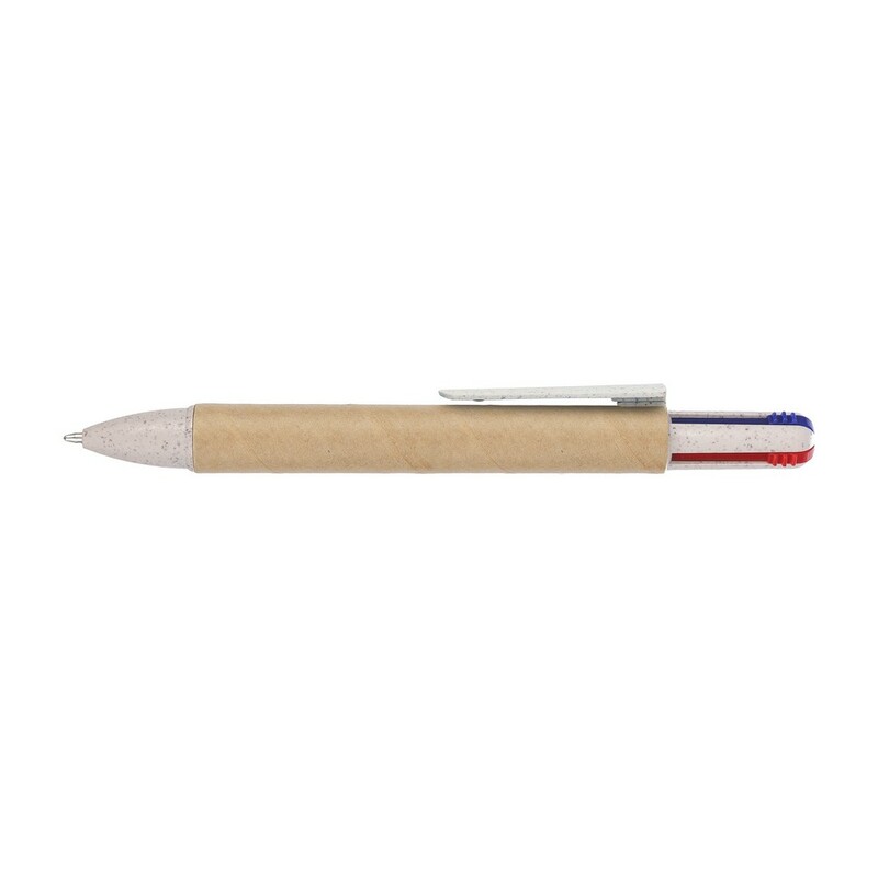 Czterokolorowy długopis, kolory wkładów: niebieski, czarny, czerwony i zielony, długość pisania 300 metrów na każdy kolor, klip ułatwiający zawieszanie na kieszeni albo okładce notatnika, produkt wykonany z kartonu pochodzącego z recyklingu i słomy pszenicznej
