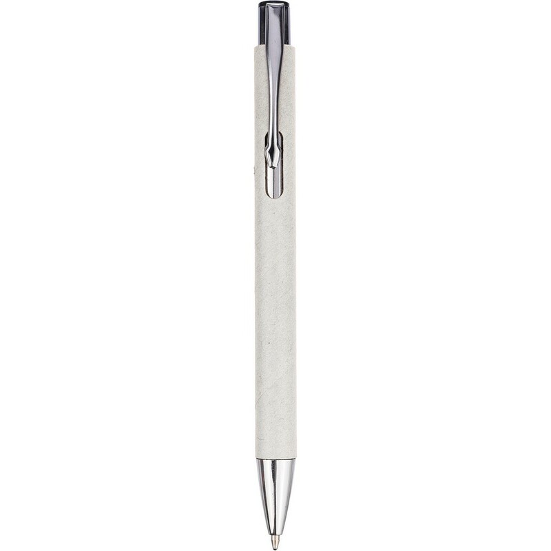 Długopis, klip ułatwiający zawieszanie na kieszeni albo okładce notatnika, wkład w czarnym kolorze, trzon wykonany z papieru z recyklingu, klips z metalu, końcówka z plastiku