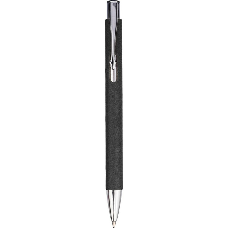 Długopis, klip ułatwiający zawieszanie na kieszeni albo okładce notatnika, wkład w czarnym kolorze, trzon wykonany z papieru z recyklingu, klips z metalu, końcówka z plastiku