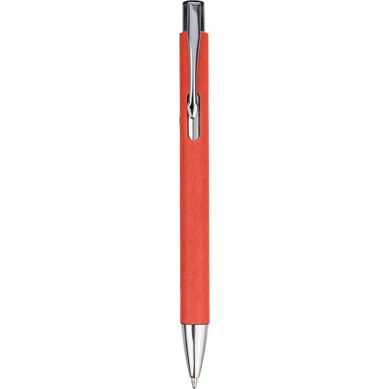 Długopis, klip ułatwiający zawieszanie na kieszeni albo okładce notatnika, wkład w czarnym kolorze, trzon wykonany z papieru z recyklingu, klips z metalu, końcówka z plastiku