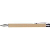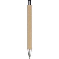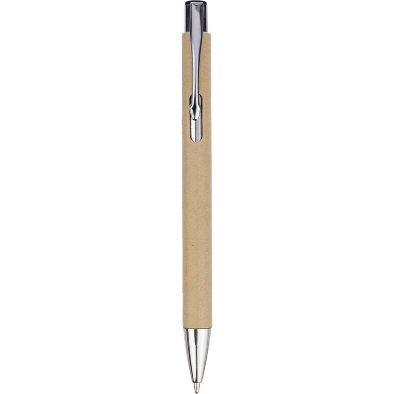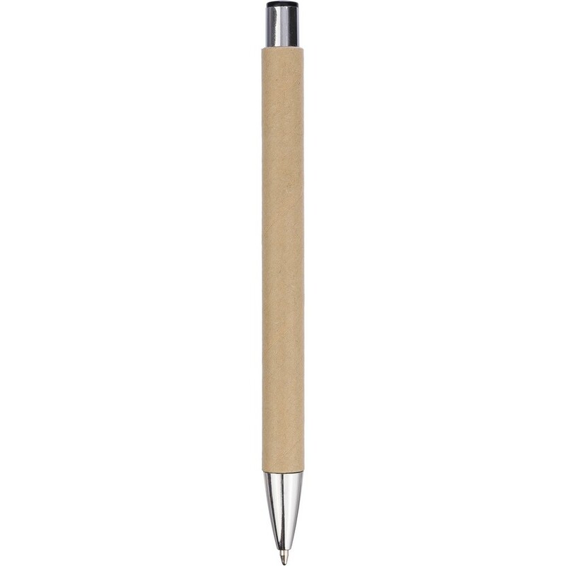 Długopis, klip ułatwiający zawieszanie na kieszeni albo okładce notatnika, wkład w czarnym kolorze, trzon wykonany z papieru z recyklingu, klips z metalu, końcówka z plastiku