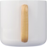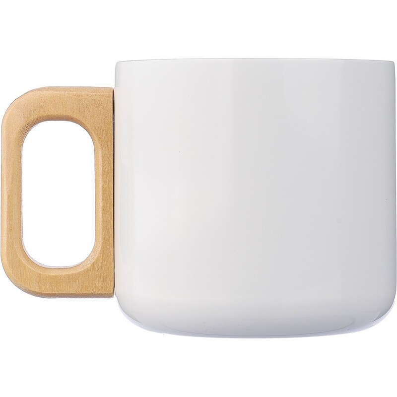 Kubek 400 ml posiada podwójne ścianki ze stali nierdzewnej z recyklingu, które chronią przed poparzeniem, solidny uchwyt z drewna, ikona stali nierdzewnej z recyklingu na produkcie, zapakowany w brązowy kartonik, produkt wykonany ze stali nierdzewnej