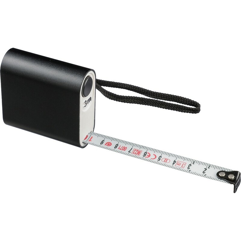 Miara 3m w centymetrach, opaska na nadgarstek ułatwiająca noszenie, zapakowana w brązowy kartonik, produkty wykonany z ABS i metalu