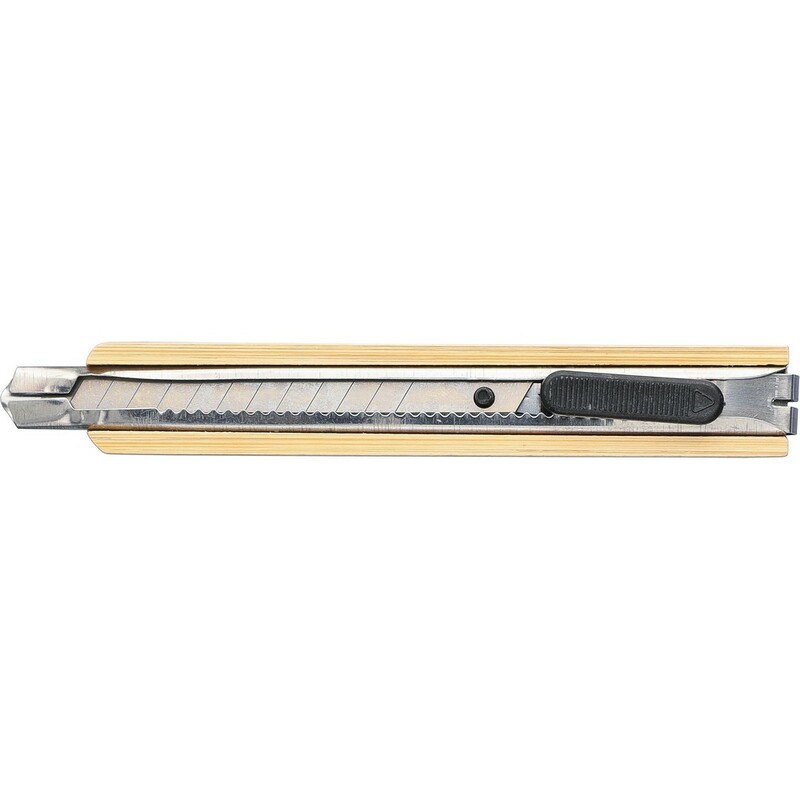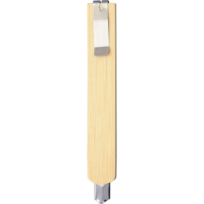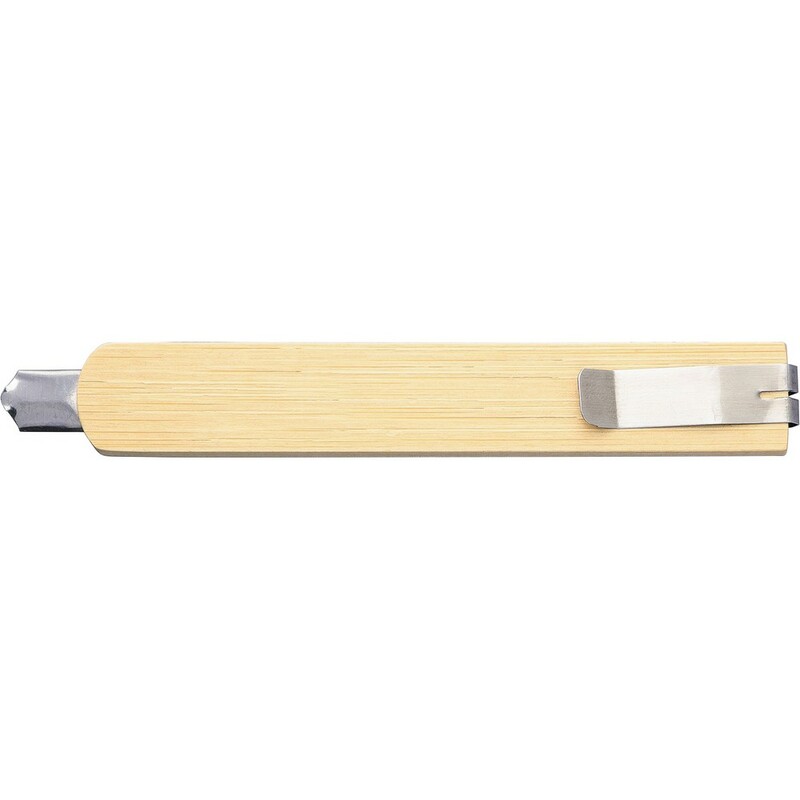 Bambusowy nóż do tapet, klips za pomocą którego chowa się ostrze, produkt wykonany ze stali nierdzewnej (ostrze) i bambusa (trzon)