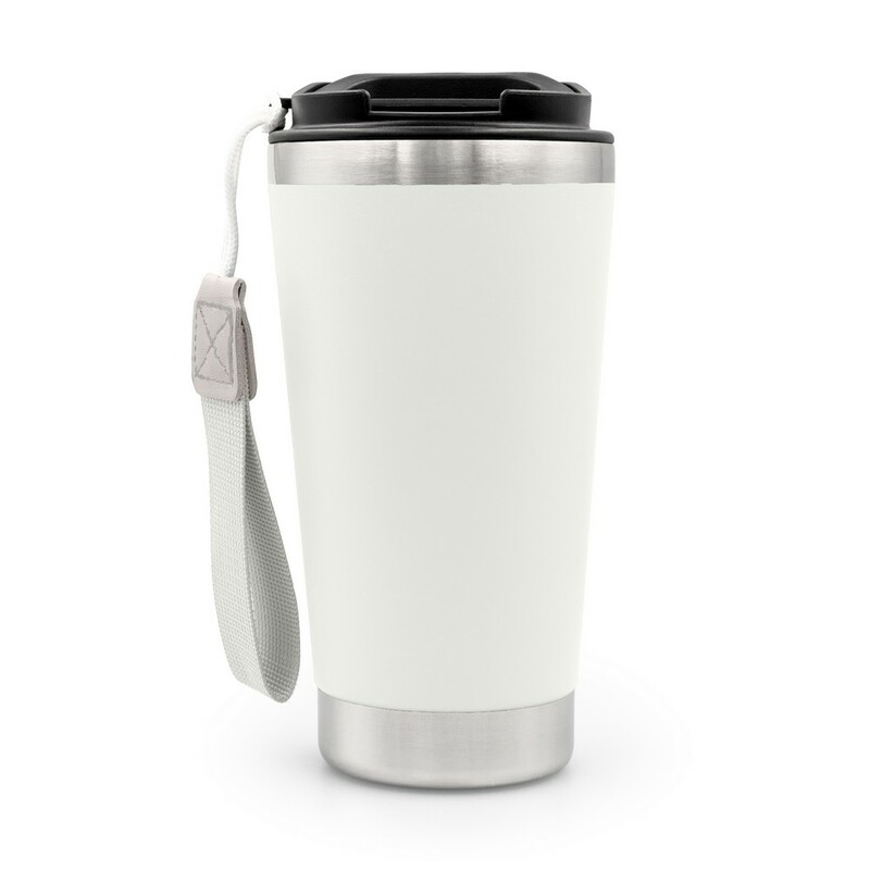 Kubek termiczny 500 ml posiada podwójne ścianki ze stali nierdzewnej z próżnią między ściankami, co spowalnia oddawanie temperatury na zewnątrz, zachowując funkcje termosu, pasek zwiększający wygodę użytkowania, ikona stali nierdzewnej z recyklingu na produkcie, zapakowana w brązowy kartonik, produkt wykonany ze stali nierdzewnej, silikonu, PP, PU, poliestru, utrzymuje temperaturę napojów gorących do 20 godzin +leakproof