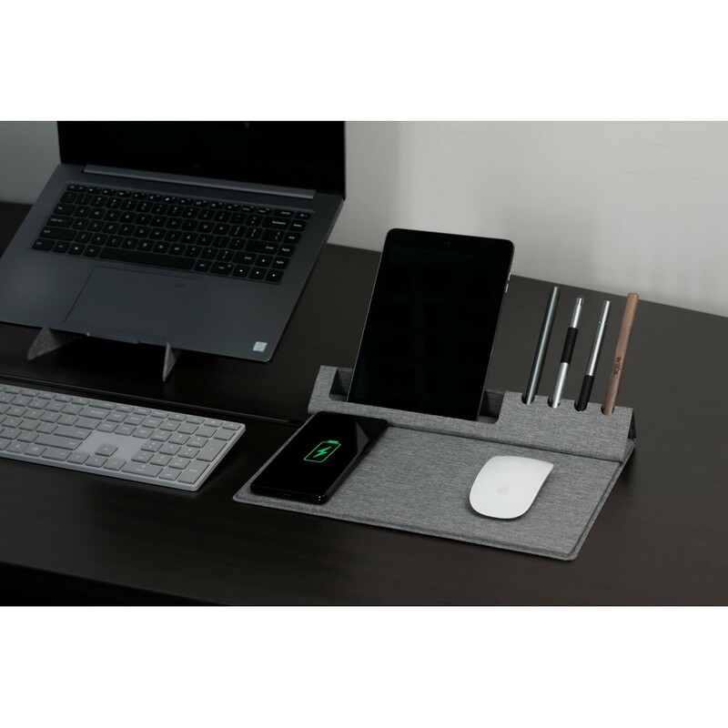 Ładowarka bezprzewodowa BrandCharger Evopad Charge, wykonana z przetworzonych powtórnie butelek PET, bezprzewodowa ładowarka, podkładka pod mysz, uchwyt na telefon i uchwyt na długopis w jednej kompaktowej obudowie, produkt wykonany z poliestru, kartonu i RPET