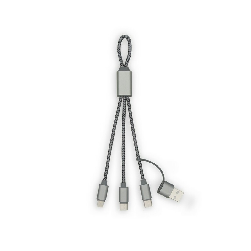 Kabel do ładowania i synchronizacji BrandCharger Trident 2, o żywotności ponad 12 000 zgięć, co czyni go sześciokrotnie mocniejszym niż standardowe kable, zbudowany z aluminiowej podstawy i wzmocnionego nylonowego oplotu, kompatybilny ze złączami USB-A, typu-C i kompatybilny z urządzeniami iOS, produkt wykonany z nylonu, aluminium i RPET