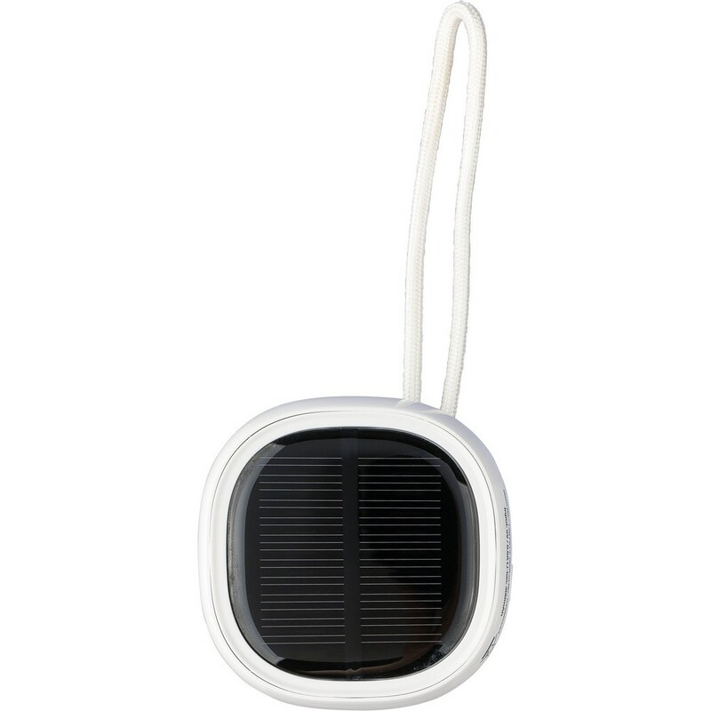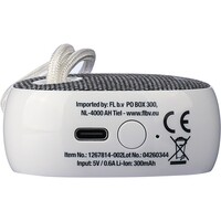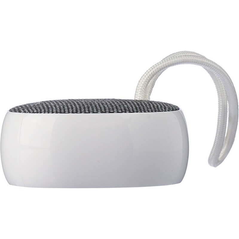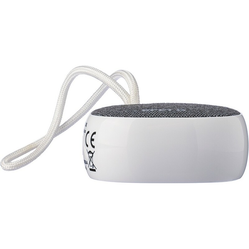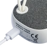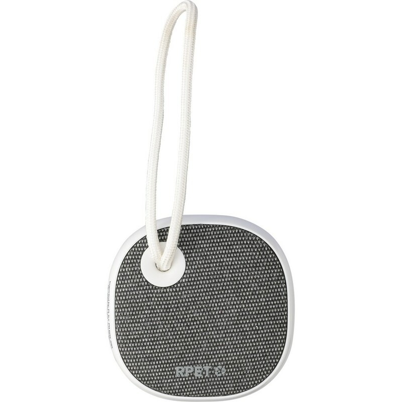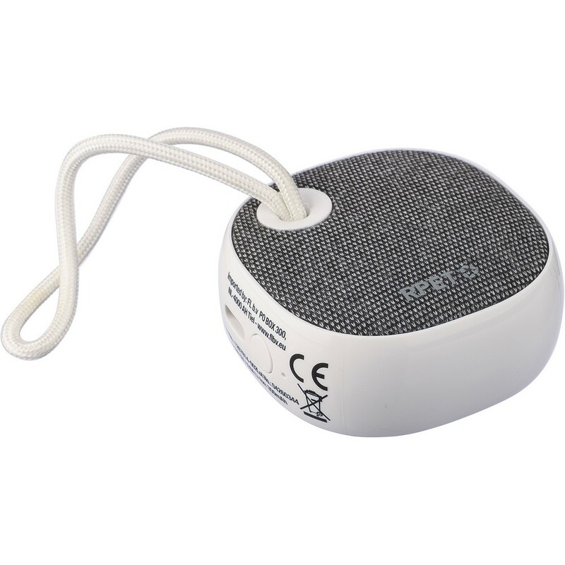 Głośnik bezprzewodowy BT 5.3, 3W, bateria 300 mAh, zasięg: 10 m, sznurek ułatwiający noszenie, biały kabel USB 30 cm w komplecie, ikona RPET na tkaninie, ikona recyklingu na produkcie, zapakowany w brązowe kartonowe pudełko, produkt wykonany z ABS i RPET